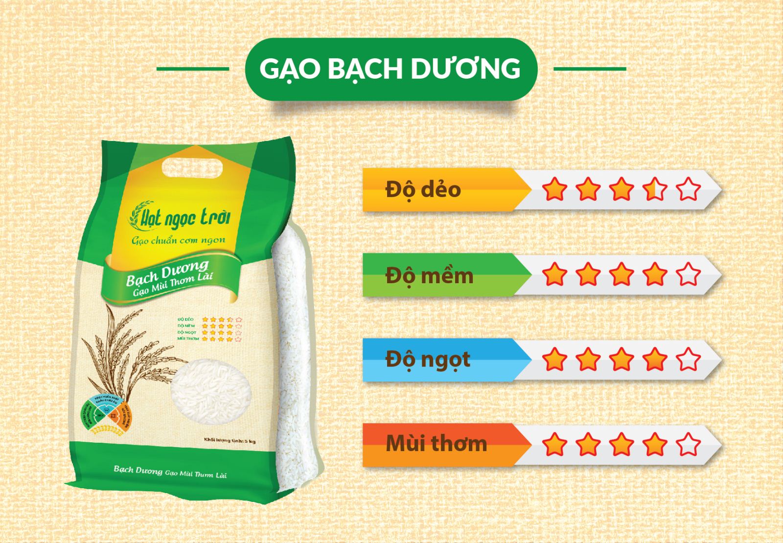 Gạo Hạt Ngọc Trời Bạch Dương là sự kết hợp giữa giống lúa và vùng trồng duyên hải nên cơm có vị đậm đà của biển, dẻo, mềm, mùi thơm lài, vị ngọt đặc trưng phù hợp với đa số khẩu vị của người Việt Nam.