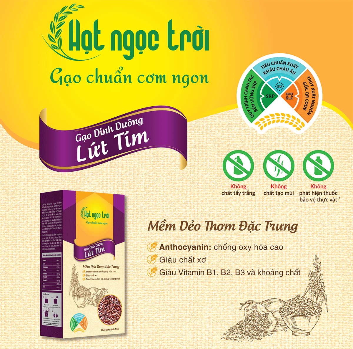Gạo dinh dưỡng Lứt Tím là sản phẩm gạo dinh dưỡng với hàm lượng chất xơ hỗ trợ tiêu hóa và nhiều khoáng chất kết hợp với Vitamin B1, B2, B3 tốt cho tim mạch. Màu tím của gạo có chứa sắc tố Anthocyanin là một hợp chất màu thiên nhiên đã được nhiều nghiên cứu chứng minh có khả năng chống oxy hóa cao, kìm hãm sự phát triển của tế bào ung thư và kháng viêm.