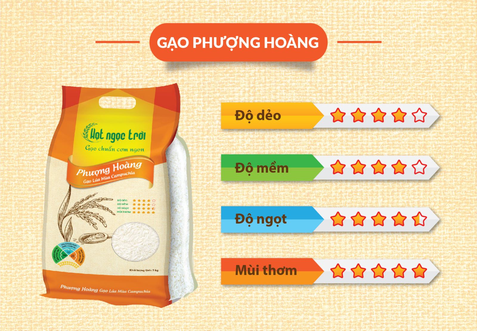 Gạo Hạt Ngọc Trời Phượng Hoàng được sản xuất và đóng gói đạt tiêu chuẩn quốc tế BRC - tiêu chuẩn an toàn thực phẩm của Châu Âu, cùng các tiêu chuẩn xuất khẩu quốc tế khác.